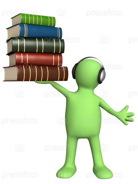 Человечек в наушниках со стопкой книг