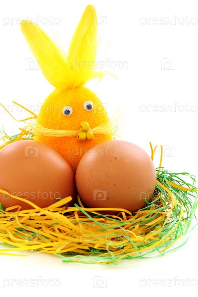 Смешной Пасхальный кролик и яйца в гнезде