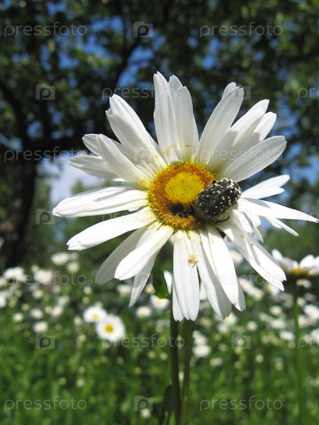 Красивая белая ромашка и маленький жук
