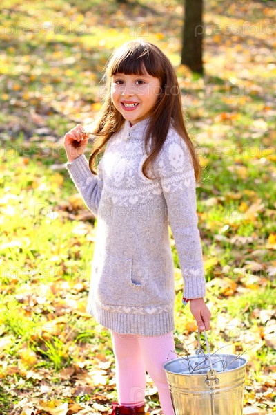 Милая маленькая девочка с ведром прикасается к волосам на открытом воздухе