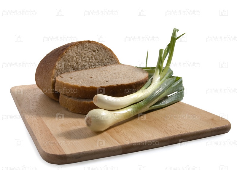 Ломтики хлеба и лук на разделочной доске