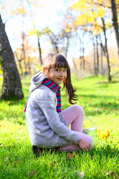 Улыбающаяся маленькая девочка с оловянным ведром на открытом воздухе