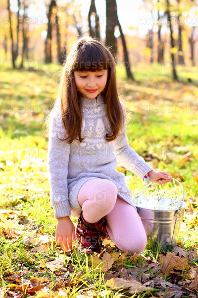 Улыбающаяся девочка с жестяным ведром стоит на коленях на свежем воздухе