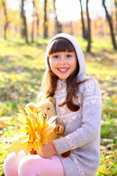 Улыбающаяся девочка с кленовыми листьями и плюшевым медведем на свежем воздухе