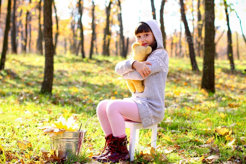 Девочка обнимает плюшевого медведя, сидя на табурете рядом с ведром на свежем воздухе