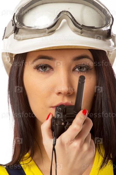 Серьезная женщина-строительный рабочий с рацией