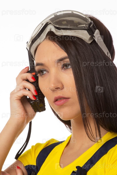 Серьезная женщина-строительный рабочий с рацией