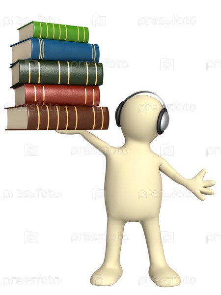 Аудиокниги. Человечек в наушниках с книгами на белом фоне