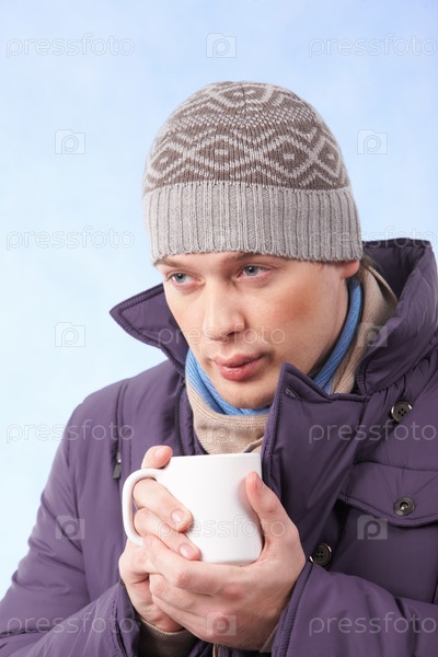 Портрет молодого человека в тёплой одежде, пьющего горячий чай или кофе