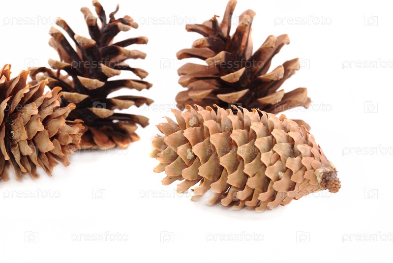 Сосновые и еловые шишки на белом фоне
