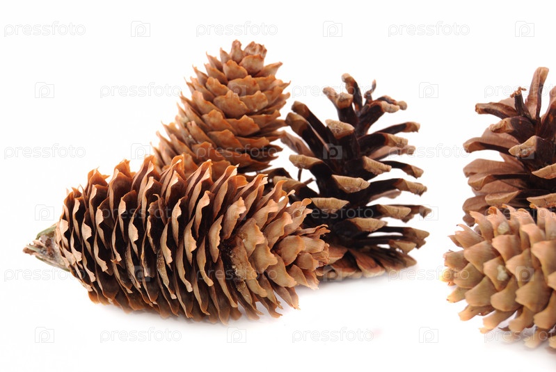 Сосновые и еловые шишки на белом фоне