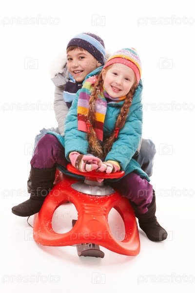 Счастливые братья и сестры смотрят в камеру, сидя на санках