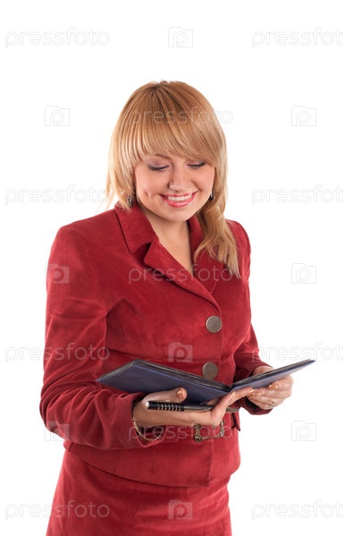 Читающая девушка в красном костюме