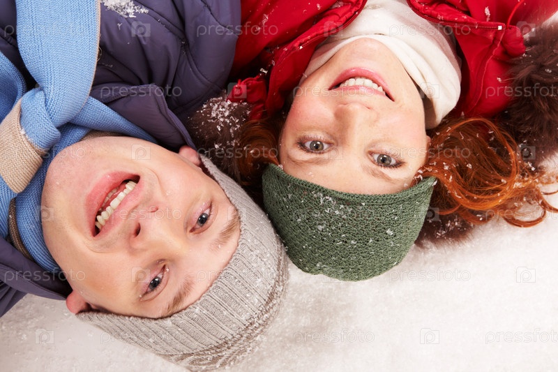 Выше снимок счастливой молодой пары, лежащей в снегу