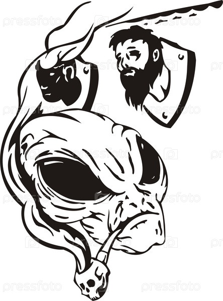 Инопланетянин курит и смотрит на трофеи с земли. Векторная иллюстрация