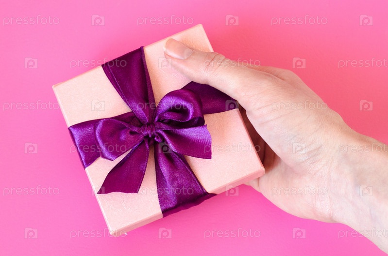 Подарочная коробка в руках женщины на фоне