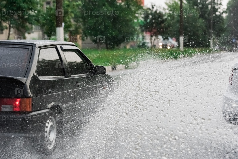 Автомобиль едет по луже