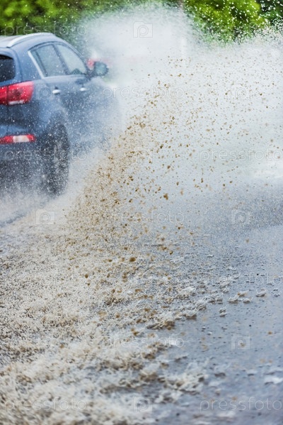 Автомобиль едет по луже