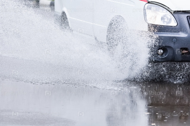 Автомобиль едет по луже