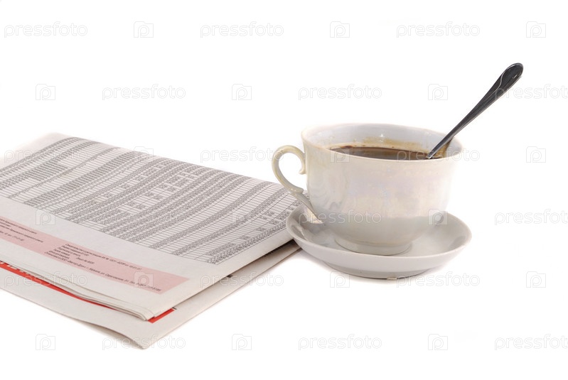 Утренняя газета и чашка крепкого черного кофе на белом фоне