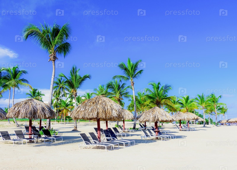 Пальмовый пляж и шезлонги