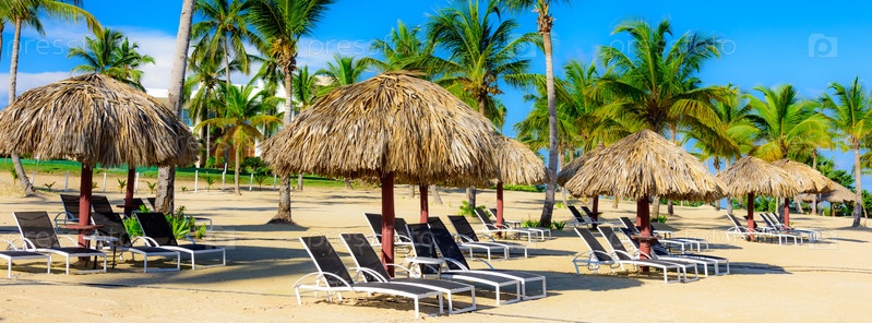 Пальмовый пляж и шезлонги