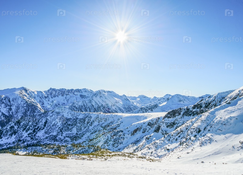 Зимний горный пейзаж на фоне голубого неба. Пики гор Пирин