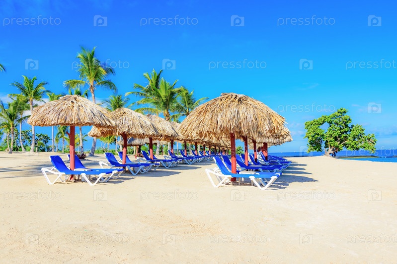 Пальмовый пляж и шезлонги