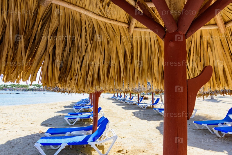 Пальмовый пляж и шезлонги