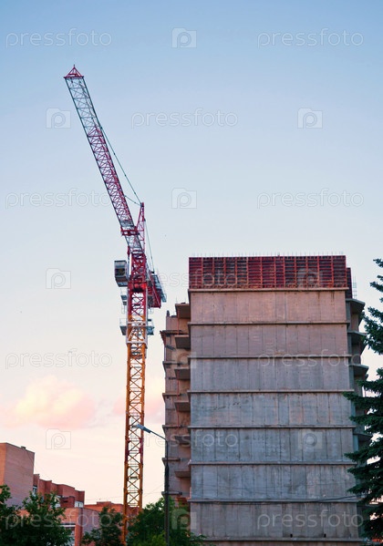 Строительство нового высокого дома с помощью крана