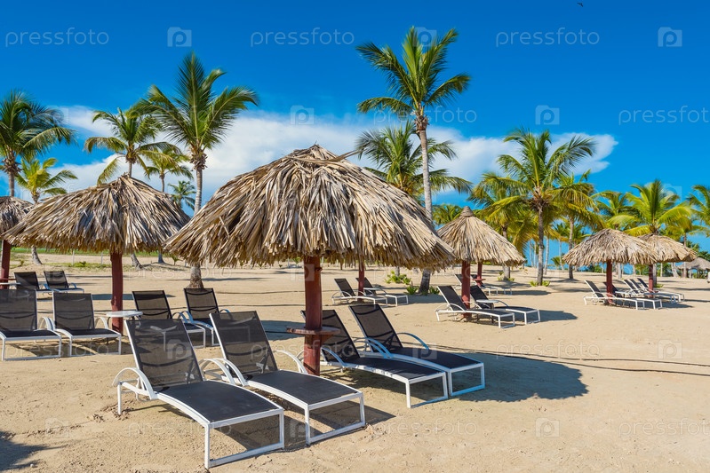 Пальмовый пляж и шезлонги