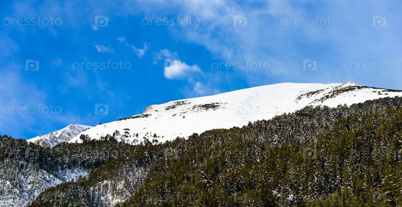 Горный пейзаж в солнечный зимний морозный день с голубым ясным небом