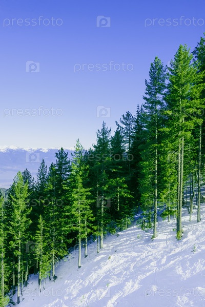 Горный пейзаж в солнечный зимний морозный день с голубым ясным небом