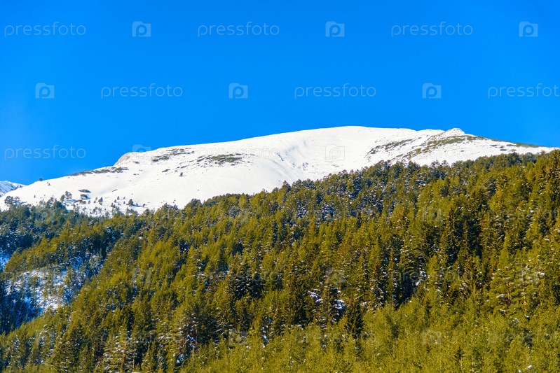 Горный пейзаж в солнечный зимний морозный день с голубым ясным небом