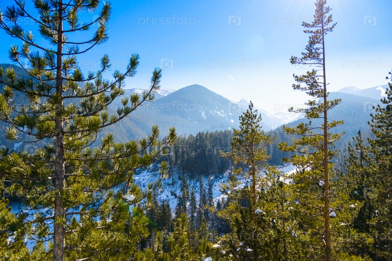 Горный пейзаж в солнечный зимний морозный день с голубым ясным небом