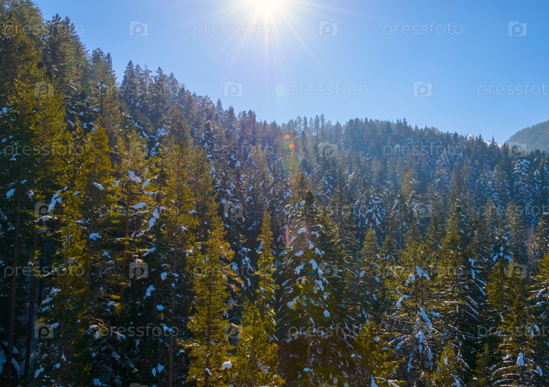 Горный пейзаж в солнечный зимний морозный день с голубым ясным небом