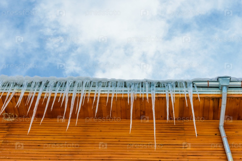 Крыша дома с сосульками на фоне голубого неба