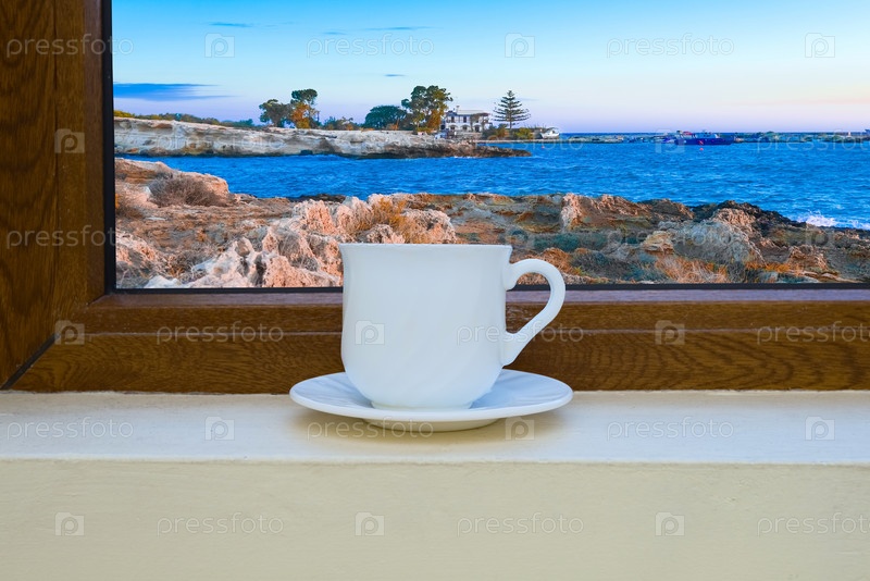 Чашка кофе у окна с видом на море летом