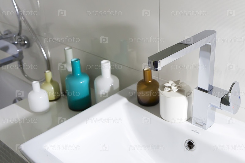 Ванная комната с умывальником и стеклянными бутылками