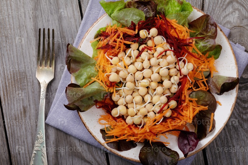 Полезные рецепты: блюдо из пророщенного гороха, свеклы, моркови и листьев салата