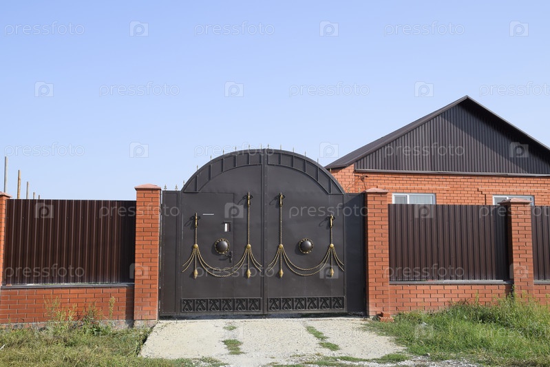 Кирпичный дом с забором и воротами