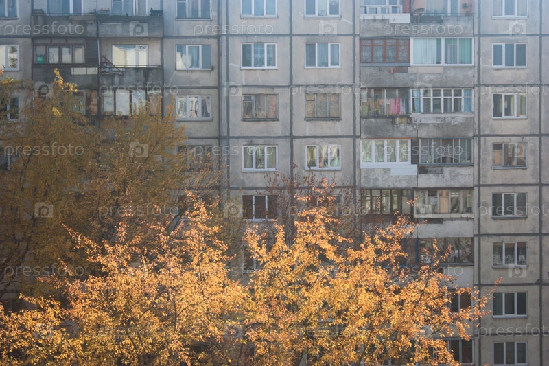 Фасад многоэтажного жилого дома осенью