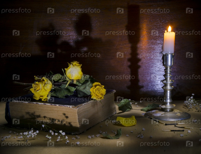 Натюрморт: желтые розы, лежащие на книги, подсвечник с горящей свечой