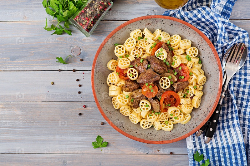 Жареная куриная печень с помидорами и гарниром из макарон