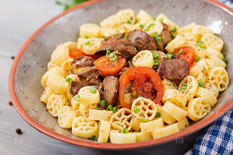Жареная куриная печень с помидорами и гарниром из макарон