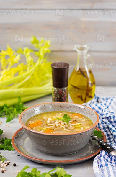 Густой суп с перловкой, сельдереем, курицей и грибами. Диетическое меню