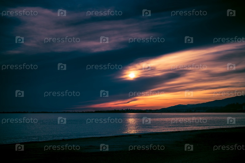 Драматическое закат на фоне моря и побережья