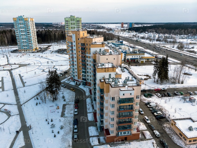Вид сверху Зеленоградского административного округа Москвы в зимний период, Россия