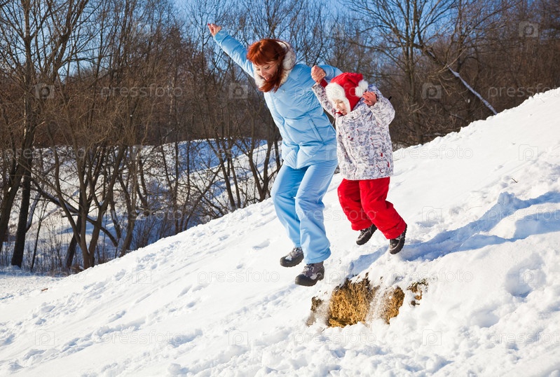 Мать и дочь играют в снегу