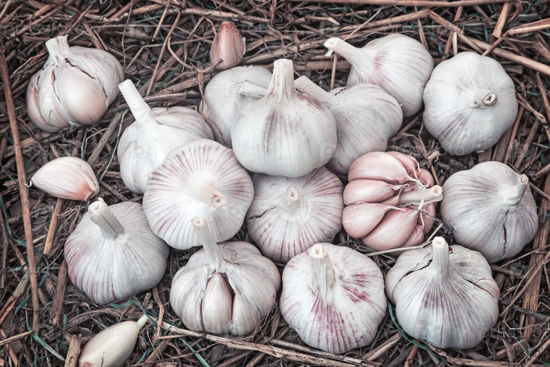 Плоды чеснока на соломе